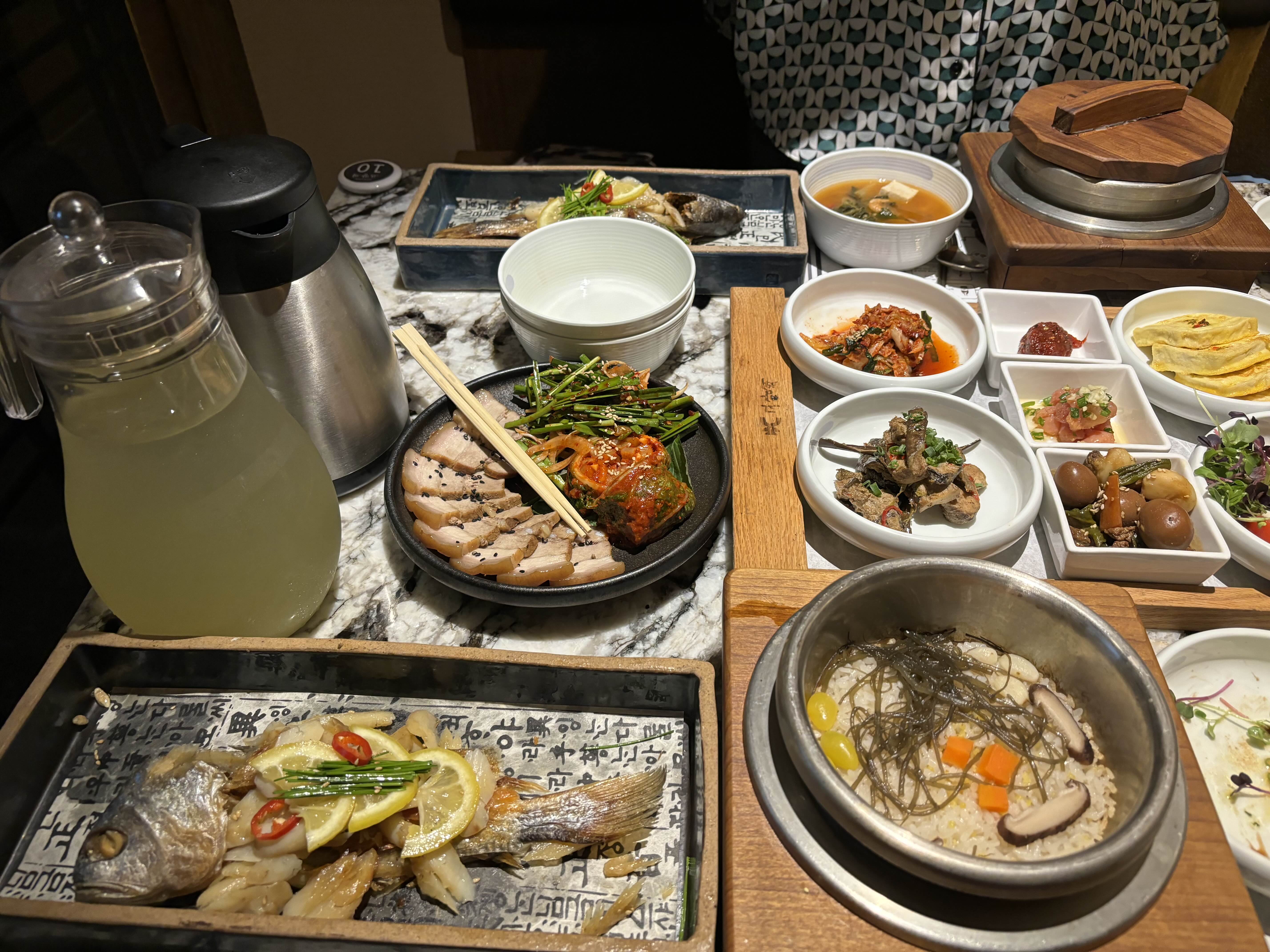 보리굴비 정식을 주문하고 기다리는데, 반찬 먼저 서비스해주시는 센스. 배가 고파 반찬을 한 판 클리어했더니 다시 가져다 주신다. 주문한 음식이 조금 늦게 나왔다며 서비스로 보쌈도 챙겨주시고, 수저를 뜨거운 물에 담궈다 주시는 센스에, 준비된 밑받찬 떨어졌다고 다른 반찬 더 챙겨주셨다.