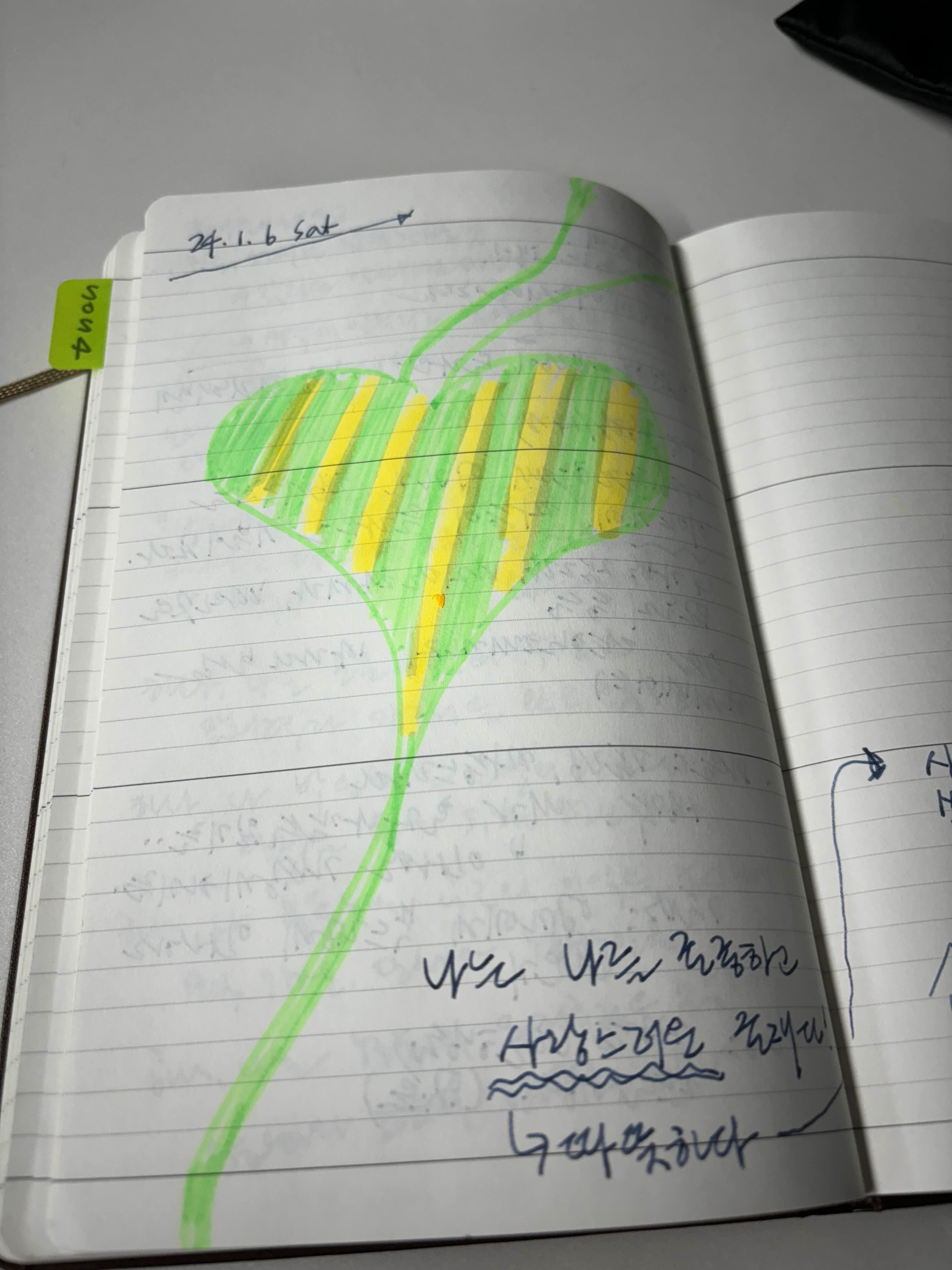 마음코칭 FT 팔로우업 과정으로 연초를 열게 되었는데요, 심호흡을 하고 난 뒤 이미지를 그렸더니 하트가 떠올랐어요. 에버 알머슨의 하트를 오마주 했다고 할까요. 들숨은 크게 한 숨 들이쉬고, 깊게 저 아래까지 나쁜 기운 뽑아 내는 느낌으로 길게 나가는 모습을 표현했습니다. 최근 읽은 전시회 소개글에서 ‘스트라이프’가 시각적으로 임팩트가 강하다는 것을 봤던 것이 떠올라 필통 안에 있던 하이라이트펜 컬러로 스트라이프 하트를 그렸습니다.