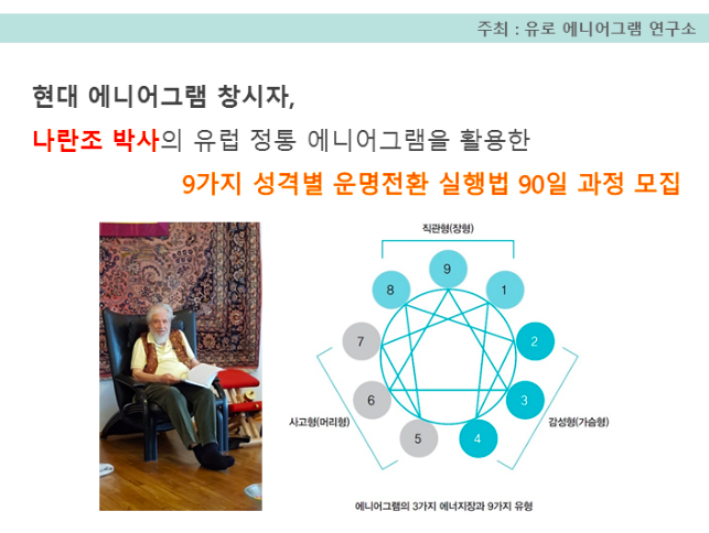 자연스럽게 자기소개를 하면서 시작했다. 수희향님도 자기소개 및 유로 애니어그램에 대한 전반적인 이해를 할 수 있는 이야기를 풀어주셨다. 그동안 내가 알던 애니어그램은 설문지 문항을 통해 분석을 하는 형태였다면, 유로 애니어그램의 가장 큰 특징은 설문분석이 아니라 나를 온전히 보면서 나의 기질을 찾아주는 것이다. 잘 기억이 나진 않지만 러시아의 어떤 종교인이 이를 유럽으로 전파를 해서 독일의 나란죠박사라는 분께서 유럽에서 애니어그램을 창시를 했다고 한다. 나란죠 박사는 기질을 파악할 때는 설문을 통해서 하지 말라고 하셨다는데, 이게 미국으로 건너가 분석지를 만들어서 기질을 파악하고 있다고. 미국의 실용성이 돋보이는 부분이었다.