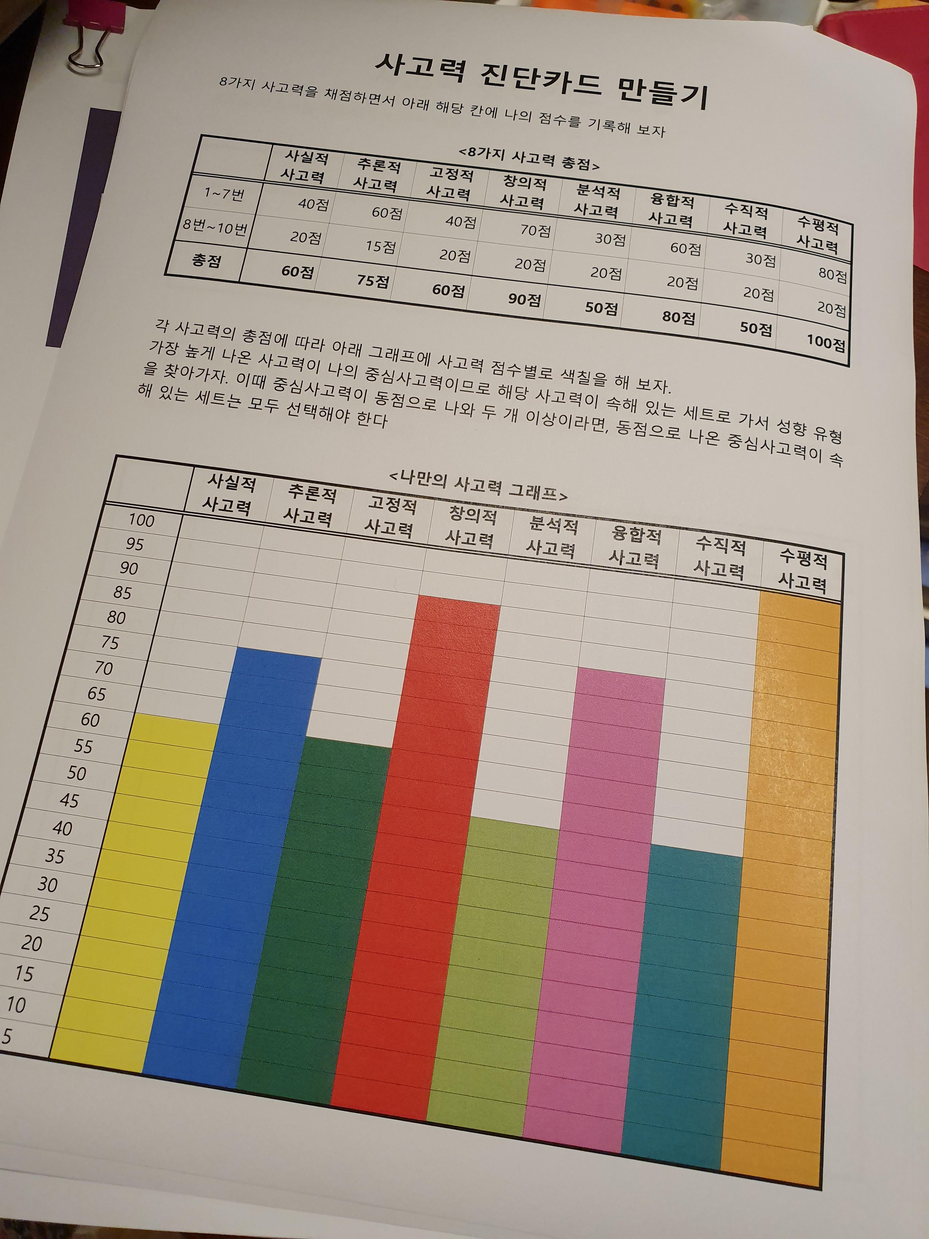 나에겐 수평적 사고력이 제일 크고, 창의적->융합적->추론적 사고력 순으로 발달이 된 것을 알 수 있다. 특히 분석적, 수직적 사고력이 제일 낮고, 사실적, 분석적 사고력은 낮은 것을 발견했다. 좌뇌보단 우뇌가 발달했다는 의미로 해석해도 될까?