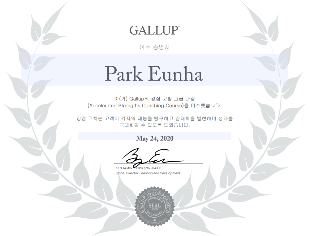 강점교육을 받고 2주만에 필기시험, 6명의 강점진단 수행 후 피드백을 받고 난 뒤에 미 갤럽 공식인증 강점코치가 되었다. 최단 기간에 코치가 되었는데, 나는 성취나 몰입, 집중 이런게 부족하고 관심이 없는데 어떻게 이렇게 해냈는지 지금도 신기하다. 앞으로 이 강점코칭을 통해 많은 사람들이 자신의 삶을 탁월하게 살 수 있는데 도움이 되고 싶다.
