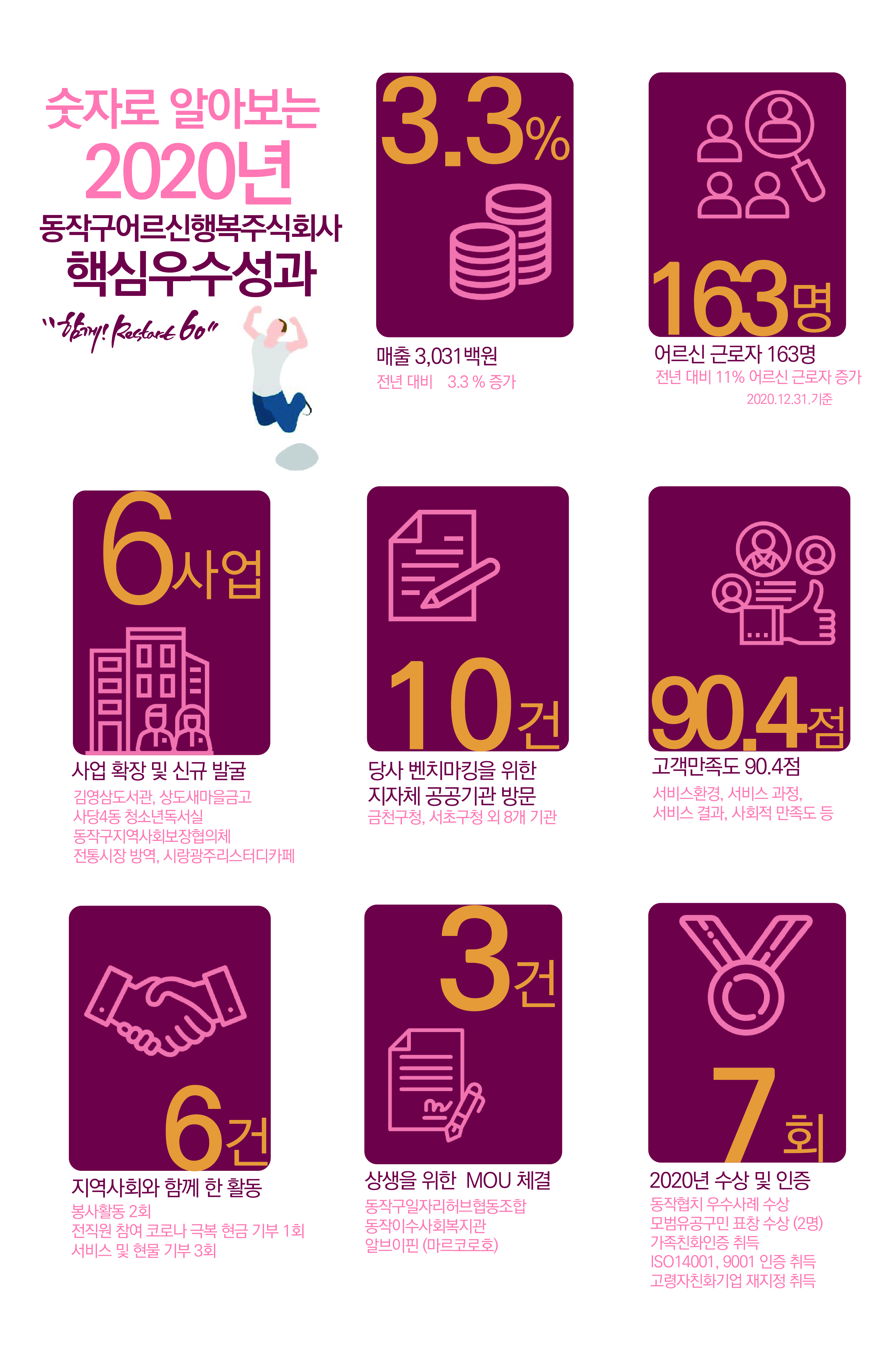 2020년 전 국민이 한 마음으로 COVID-19를 극복하기 위해 노력했을 때, 동작구어르신행복주식회사도 우리 모두 각자의 위치에서 한 마음 한 뜻으로 정말 최선을 다했습니다. 특히 선제적으로 준비했던 '해피클린'의 소독 방역사업은 좋은 성과를 이뤄낼 수 있었습니다. 산타맘도 아이돌봄에서 통합돌봄 서비스로 가기 위해 준비를 하기도 했고, 할美꽃은 네이버 스토어팜을 비롯 바보사랑, 굿네이버스의 기부스터어까지 온라인 매장을 확대했습니다.