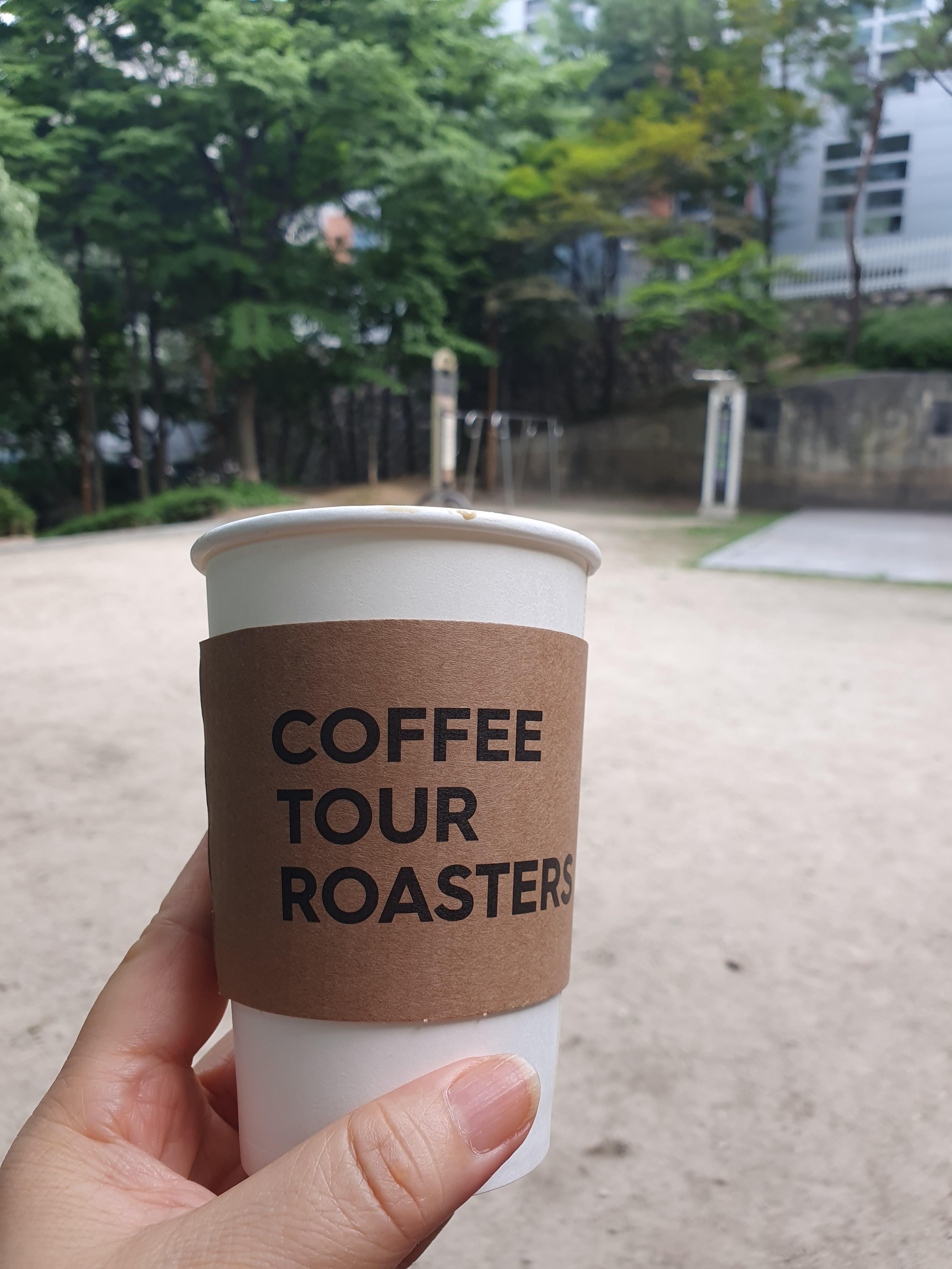 정신차리기 위해 '커피투어' 에서 카페라테 테이크 아웃해서 집 앞 공원에서 즐긴다. 살짝 부는 바람과 동네 강아지들 인사 소리, 정자 아래 앉아 계시는 할아버지가 주말 오후를 편안하게 마무리하게 해주는 듯 하다.