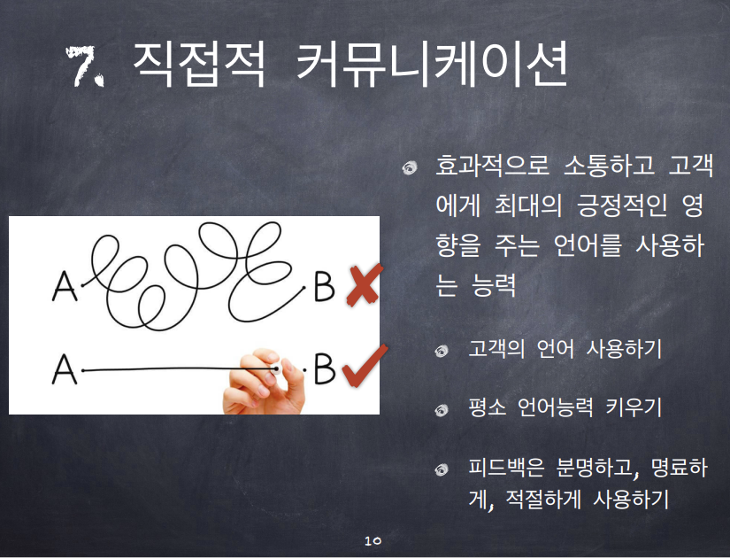 '직접적 커뮤니케이션'이란 코칭 과정 중에 효과적으로 소통하고 고객에게 최대의 긍정적인 영향을 주는 언어를 사용하는 능력을 말한다.