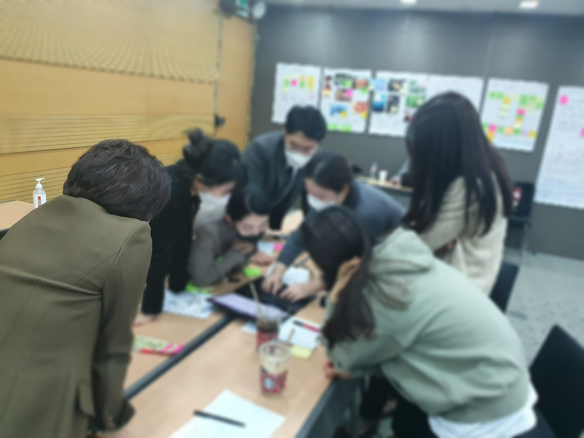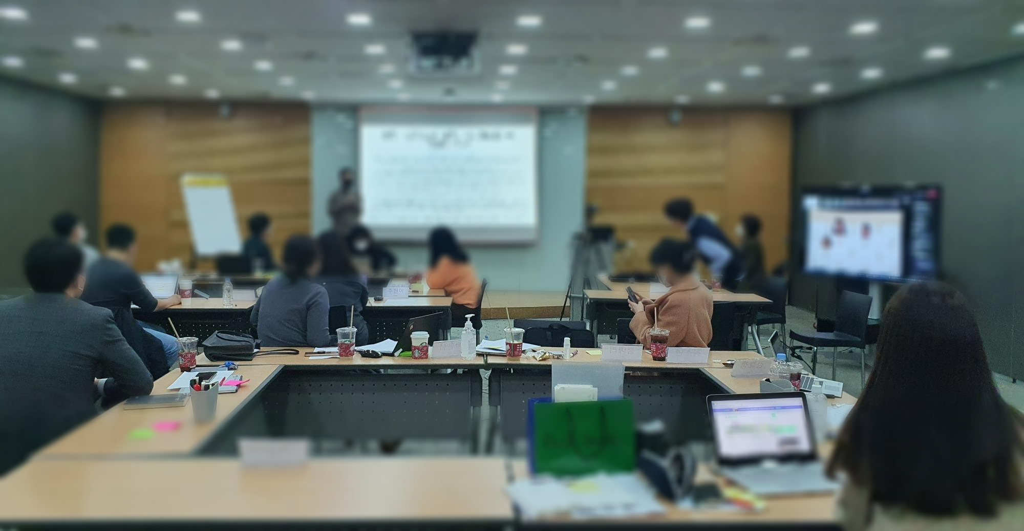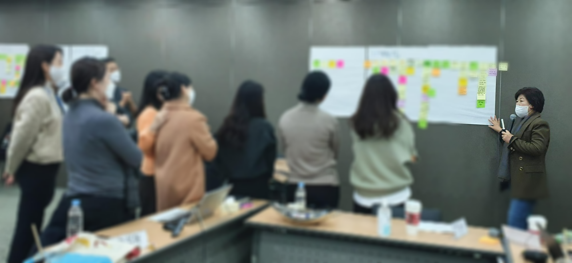 블루밍경영연구소 김상임 대표코치와 함께, 지난 12월 9일 강남 테헤란로에 위치한 한 제약회사의 비전워크숍을 진행했습니다. 얼마 전 부임한 사업부의 상무님께서 전 구성원과 함께 조직의 핵심가치와 미션, 비전 등을 재구성하고 2022년 사업부의 전략적 성과관리 시스템을 체계적으로 마련하고자 하는 니즈를 반영한 워크숍이었습니다. 고객과 사전 미팅을 통해 니즈를 파악하고 H제약회사 맞춤형 워크숍을 디자인하였습니다. 그동안 온라인 워크숍 등으로 진행되다 오프라인이 점차 확장되는 시기였지만, 온·오프라인 하이브리드 워크숍으로 진행된 것도 이번 워크숍의 백미였습니다. 온라인에 계신 분들의 집중도나 참여도가 어떠실지 살짝 걱정이 되긴 했지만 기우였음을 진행하는 동안 알 수 있었습니다. 팀 토론은 물론, 직접 발언과 채팅창을 통한 의견을 열정적으로 주시는 모습에서 모든 분들이 각자의 몫을 '잘하고 싶다'는 마음도 느낄 수 있는 시간이었습니다.