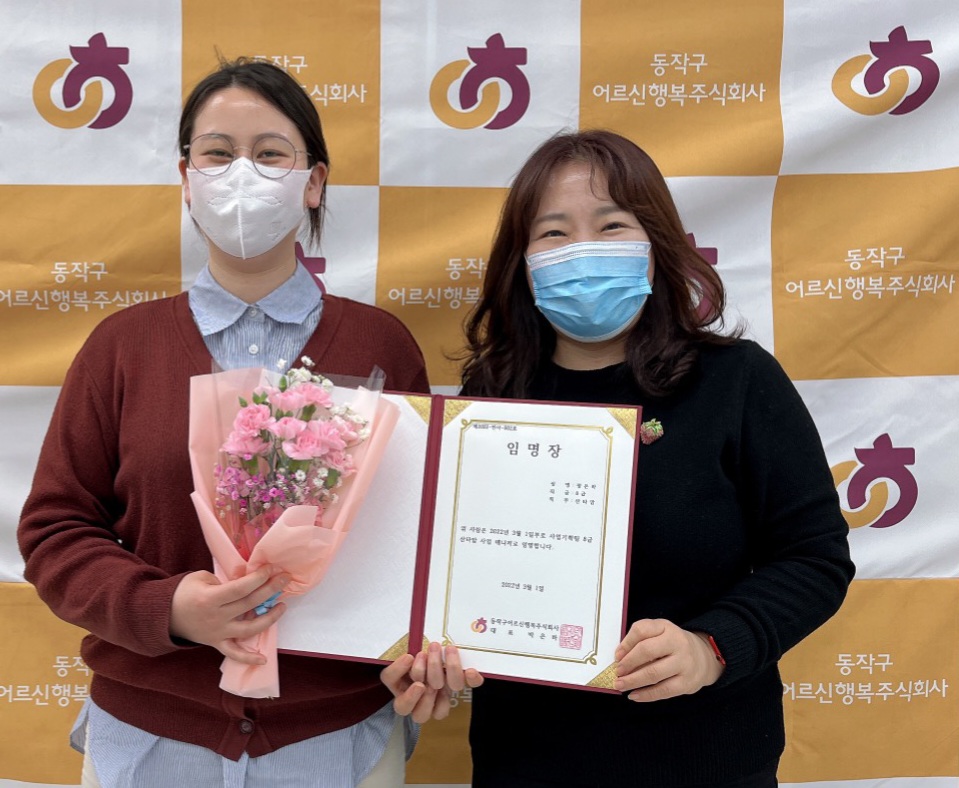 2022년 첫 정규직 전환심사를 통과한 우리 동작구어르신행복주식회사의 일잘러(일을 잘하는 사람)들, 운종님과 은하님. 축하합니다!!🎉