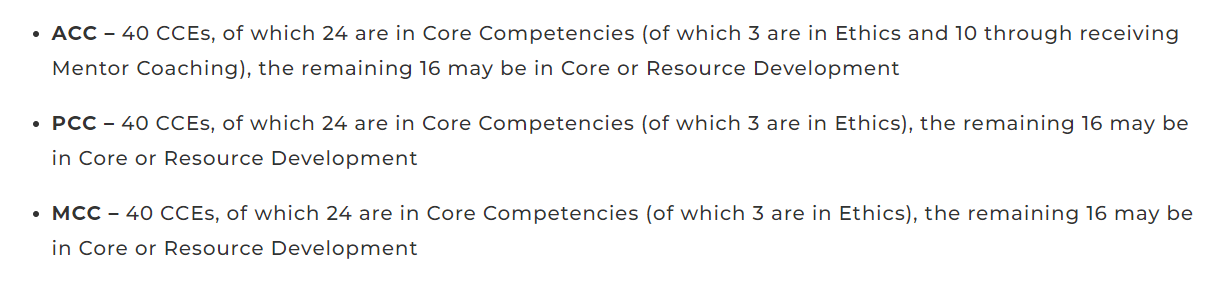 ICF에서는 3단계로 자격을 구분하고 있으니 해당하는 요건을 확인하셔서 진행하시면 됩니다. 각각 자격을 갱신하기 위해서는 40시간의 CCE 교육이 필요하다는 가이드를 잘 설명하고 있습니다. 3년간 꾸준하게 코치의 역량 개발을 하도록 해주는 시스템이라고 보시면 됩니다. 처음에는 자격을 취득하면 다 되는 줄 알고 있다가 "추가로 또 교육을 받아야 해?"라고 생각하기도 합니다. 하지만 전문코치로서 활용하면서 끊임없이 변화하는 환경 속에서, 다양한 고객들을 만나는 직업으로서 시대의 흐름과 전문역량을 훈련하고 개발하는 데 꼭 필요한 정책이라고 생각합니다. 저는 이 40시간의 교육을 받으면서 많은 배움도 있고, 코치님들과의 네트워크도 계속 유지하게 되는 선순환 시스템으로 활용하고 있습니다.
