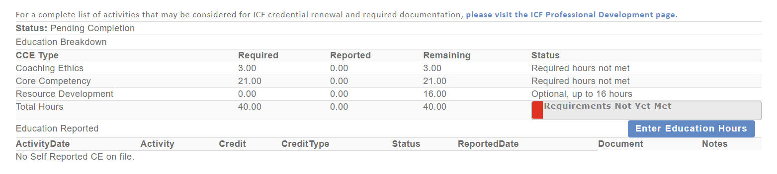 만약 CCE를 정식 발급받지 않는 경우라도 과정 강의 계획서, 자료 등등 제출하면 되는데, 좀 복잡할 수 있을 듯해요. 저는 ICF 코리아챕터에서 하는 다양한 교육들과 월례세미나, 코칭핵심역량 교육 등을 꾸준하게 들었더니 어느새 40시간이 되었더라고요. 실제로는 40시간이 넘었는데, 40시간에 맞춰서 교육 등록을 완료했습니다. 다음 갱신을 위해서 또 출발선에 선 느낌이네요. 앞으로 CCE 인증 교육을 40시간 이상 들어야 합니다. 이번 신청 경험으로 앞으로 교육 계획을 잘 디자인해서 저에게 도움이 되고, 궁극적으로 제가 만나는 고객들에게 도움이 되길 기대하고 최선을 다하겠다 다짐해 봅니다.