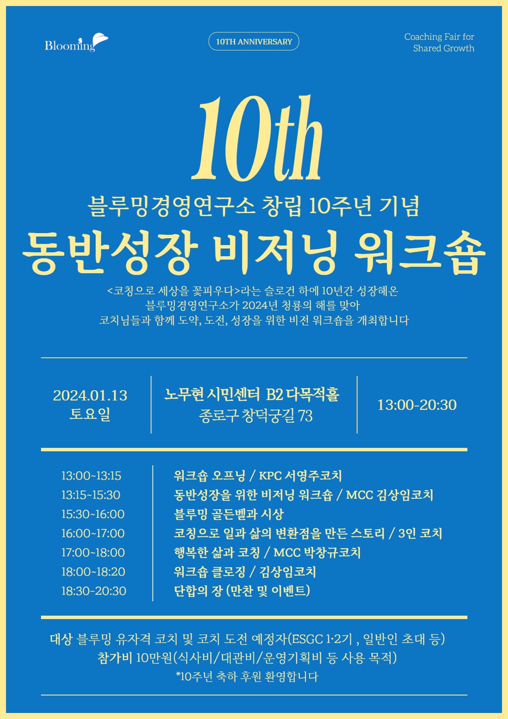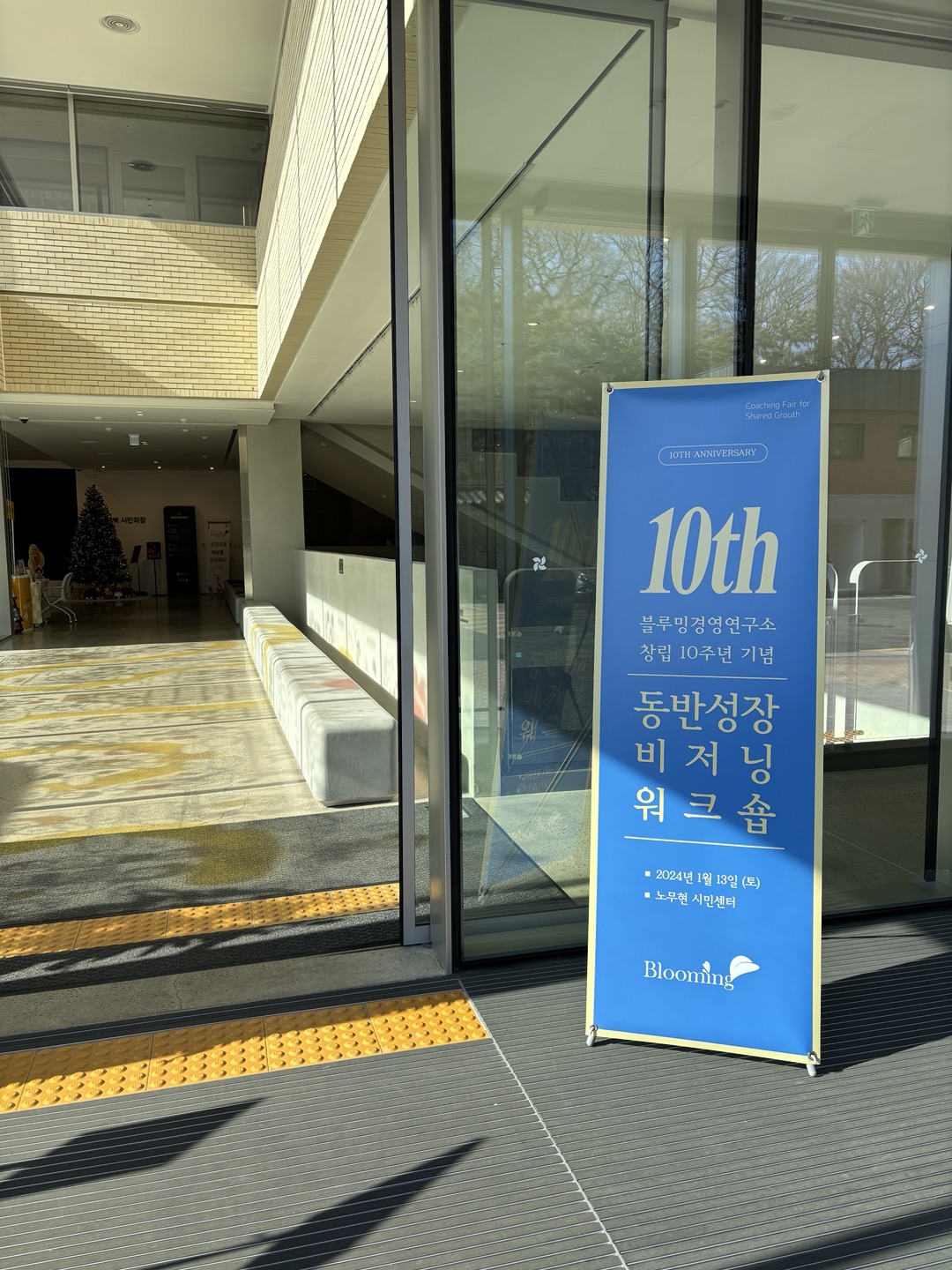 김상임코치께서 대표코치로 있는 (주)블루밍경영연구소가 2024년, 10주년이 되었습니다. 1월 13일 토요일 오후, 창덕궁 돌담길 옆에 있는 '노무현시민센터 다목적홀'에서 어제 10주년 축하 기념행사가 열려 저도 다녀왔습니다. 100여 명의 많은 코치님들께서 축하를 해주시러 한걸음에 달려와 주셨어요. 김상임코치님의 팬들이 그만큼 많다는 의미겠지요. 장소의 수용 인원 때문에 더 많은 코치님들을 모시지 못해서 아쉬우셨을 것 같아요. 저도 객석에서 행사를 참여를 하면서 많은 코치님들 뵈며 반갑고 뿌듯한 느낌이 참 많이 들었는데, 주인공이셨던 김상임코치님 무대 위에서 같은 마음이 아니셨을까 짐작해 봅니다.