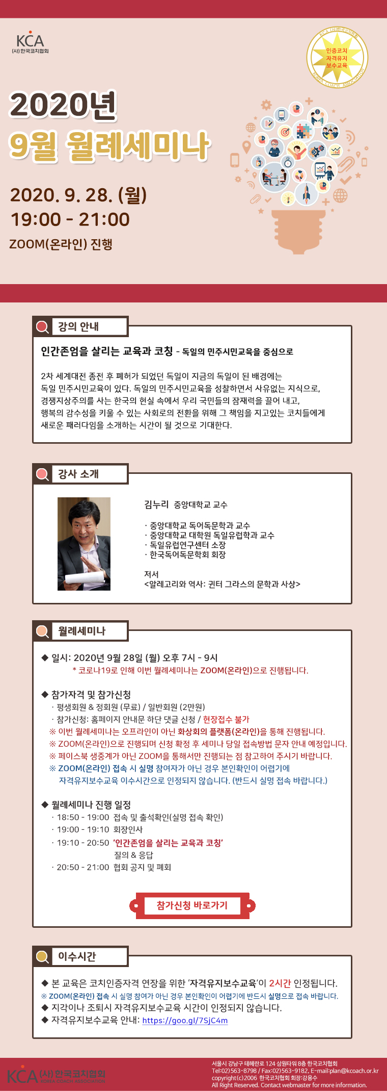 한국코치협회 월례세미나가 온라인으로 진행될 계획이다. 이젠 전혀 낯설지 않은 풍경.