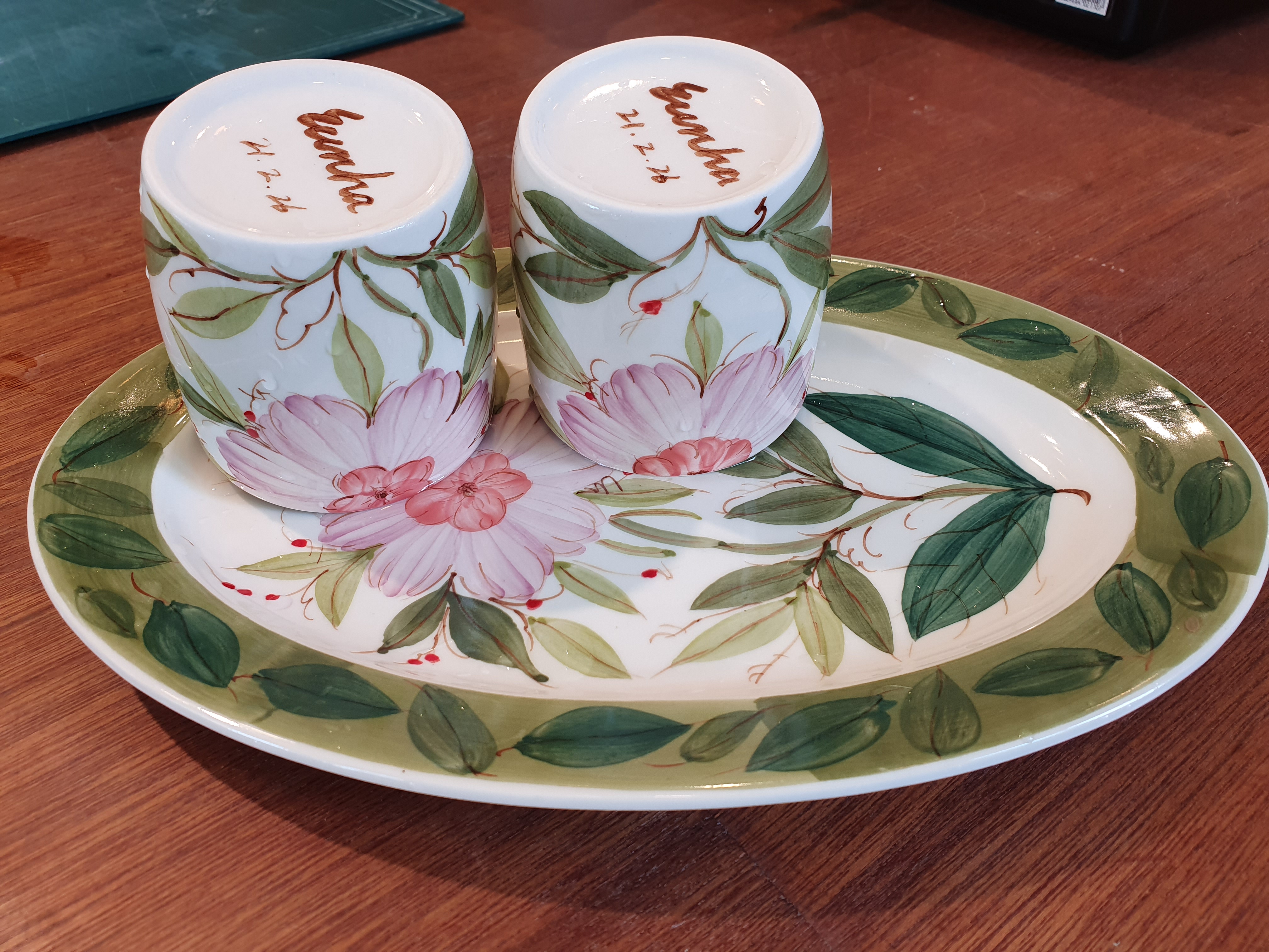 타원형 접시와 머그컵 2개를 만들었는데, 머그 손잡이에 작은 꽃과 잎사귀가 포인트다.