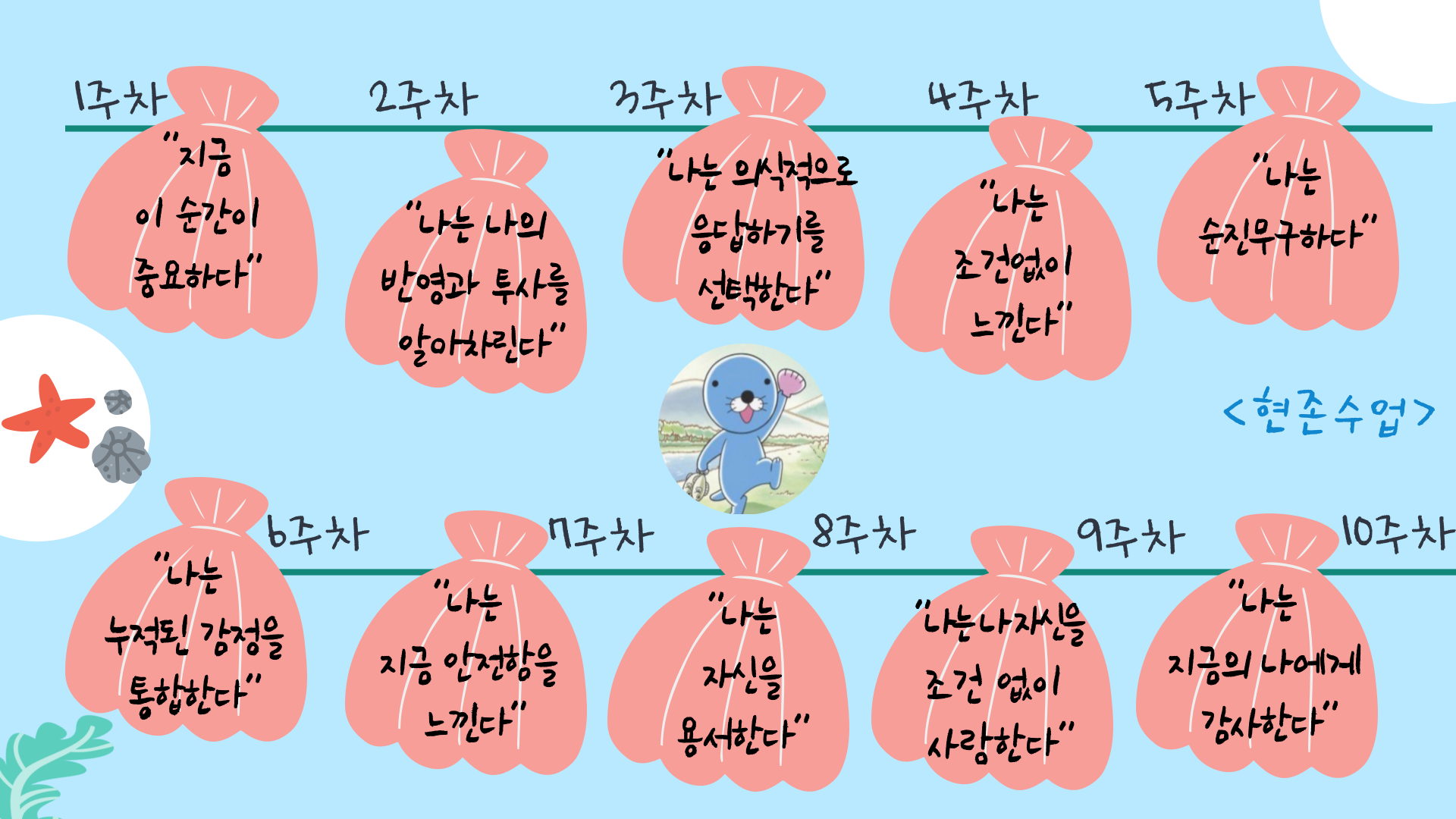 특히 7주차(OT를 포함하면 8주 차이겠지만) "나는 안전함을 느낀다"를 읽을 때는 오랜 기간 나의 삶의 이슈였던 '발표 불안증'에 대한 긴장에 대해 깊이 살표 보는 계기가 되었다. 그 덕분에 이 '긴장'이라는 감정이 어디서 왔는지 볼 수 있었다. 그 감정도 '나"였다. 내가 살펴보지 못하고, 보고 싶어 하지 않았던 나의 소중한 감정이었다. 그렇게 보듬어 주고 나니 긴장이 더 이상 두렵지 않았다.