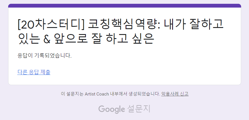 오늘 다시 홍성향코치께서 갈무리하는 차원의 설문조사를 요청하는 톡을 받고 설문을 완료했다. 그날 흘려보낼 수 있었던 것을 다시 생각해 보게 되니 느낌이 새롭고 확실히 나의 현재 상태, 마음을 알겠다.