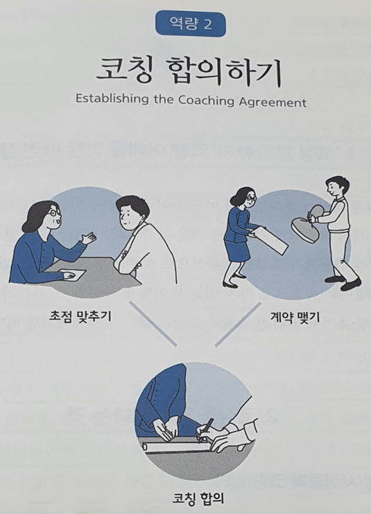 '코칭 합의하기'란 특정한 코칭 상호작용에서 무엇이 요구되는지를 이해하고, 예상 및 신규 고객과 코칭 절차 및 코칭 관계에 대해 합의할 수 있는 능력을 말한다.