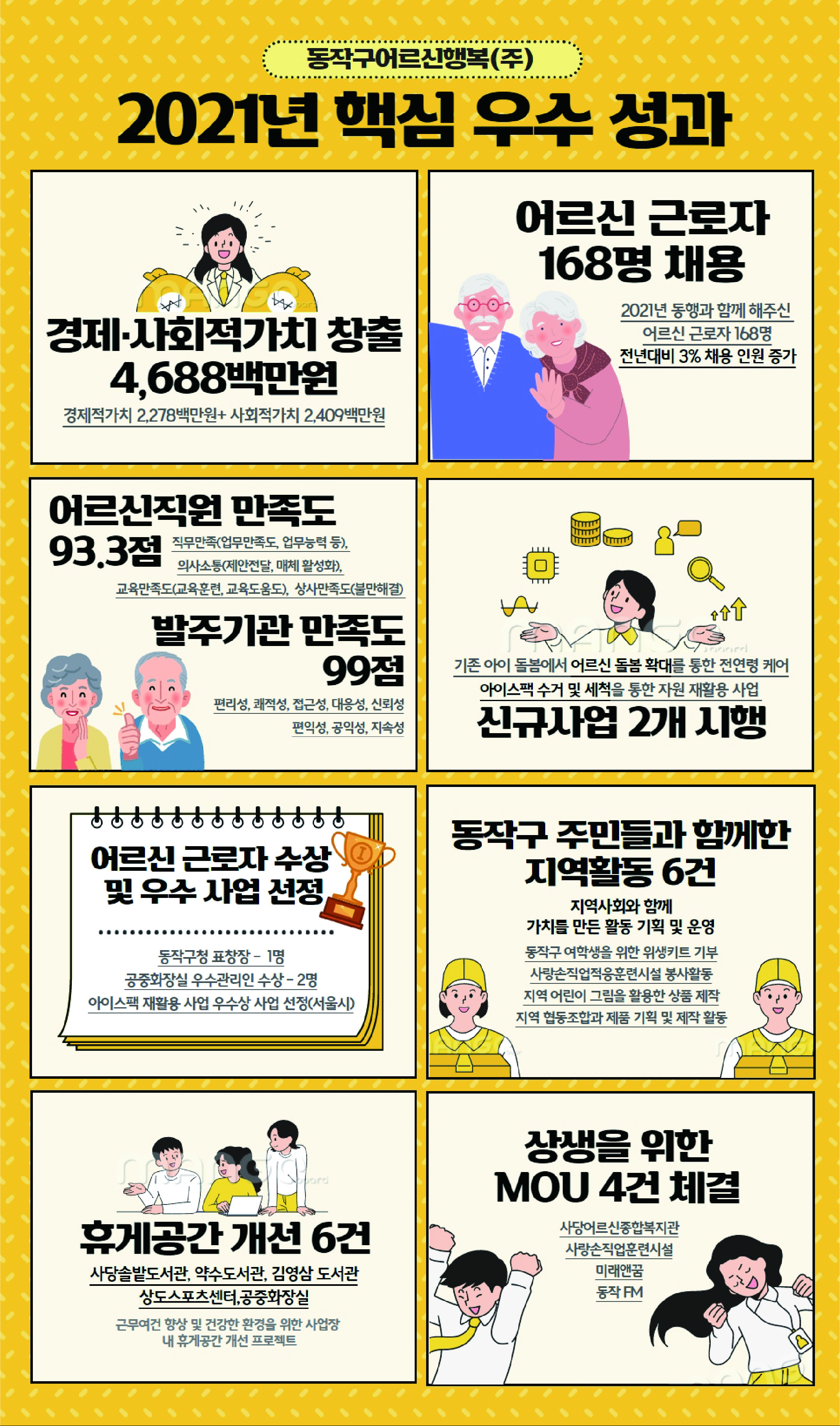 이렇게 잘해왔으니 보람도 되고, 뿌듯도 합니다. 그렇지만 또 지나면 늘 아쉽죠. 그 보람, 뿌듯함, 아쉬움 등을 또 앞으로의 성장을 위한 에너지로 전환합니다. 우리는 계속 가야하니까요! 동작구어르신행복주식회사의 지속가능한 성장을 위하여!! "행복한 변화, 사람사는 동작"에 이런 좋은 기업이 있습니다.